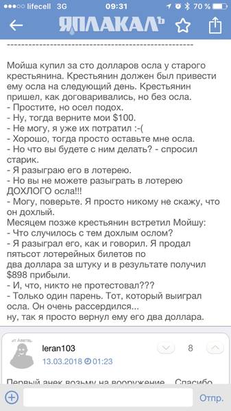 — Да там один больной начертил мелом линию на асфальте и предлагает 1000$ тому, кто сумеет проползти под этой линией.