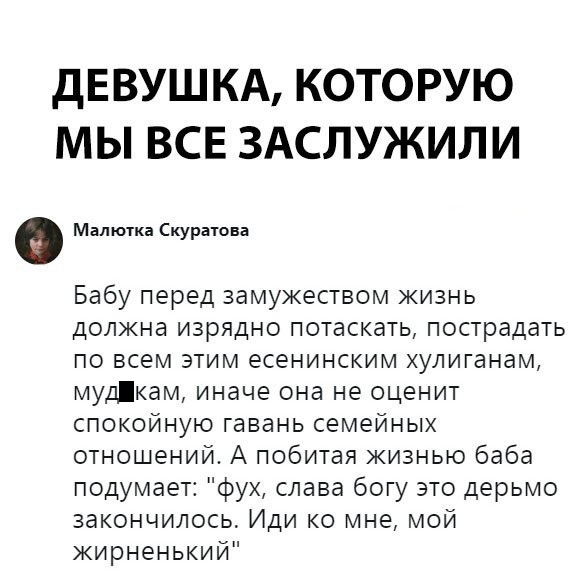 Mikke, "МЫ" -чёт даже зацепило, нах..р такая баба не сдалась, потасканая и побитая, это самоуспокоение для престарелых шлюх которые всё ждали принца на белом мерседесе, а сейчас приходится брать то что досталось
