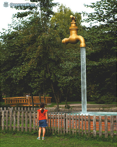 где-то читал про эти краники. он держится за трубу, которая идет внутри струи воды.
