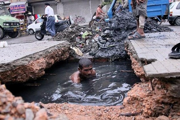 Вы считаете, что у вас плохая работа? Этот 43-летний мужчина и его друг работают в Дели (Индия) канализационными дайверами. В их работу входит ручная очистка канализации от засоров, куда они погружается и ныряют с головой. За это им платят по 3.5 доллара в день, а также выдают 1 бутылку спиртного для дезинфекции в день. За последние шесть месяцев в Дели на работе умер 61 "Канализационный дайвер".