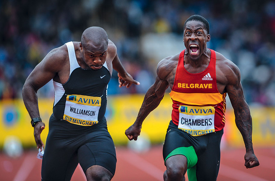 1-е место в общей категории Хариш Чавда, Великобритания Олимпийский стадион, Бирмингем, Великобритания. Дуэйн Чемберс (справа) не считался фаворитом этого забега; тем сильнее был на финише его восторг. И его крик, и напряжение мышц — все делает этот кадр гимном воли к победе.