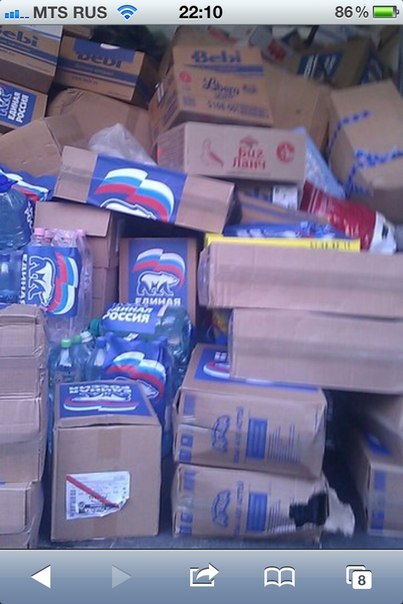 И еще. кто то тут говорил что отправляли помощь не только партия ЕДРО а еще и другая партия и они тоже клеили наклейки от своей партии. так почему я не видел фотки груза с наклейками другой партии? или это опять как были выборы партий? где не одной партии кроме ЕДРА не давали свою рекламу на улицах?