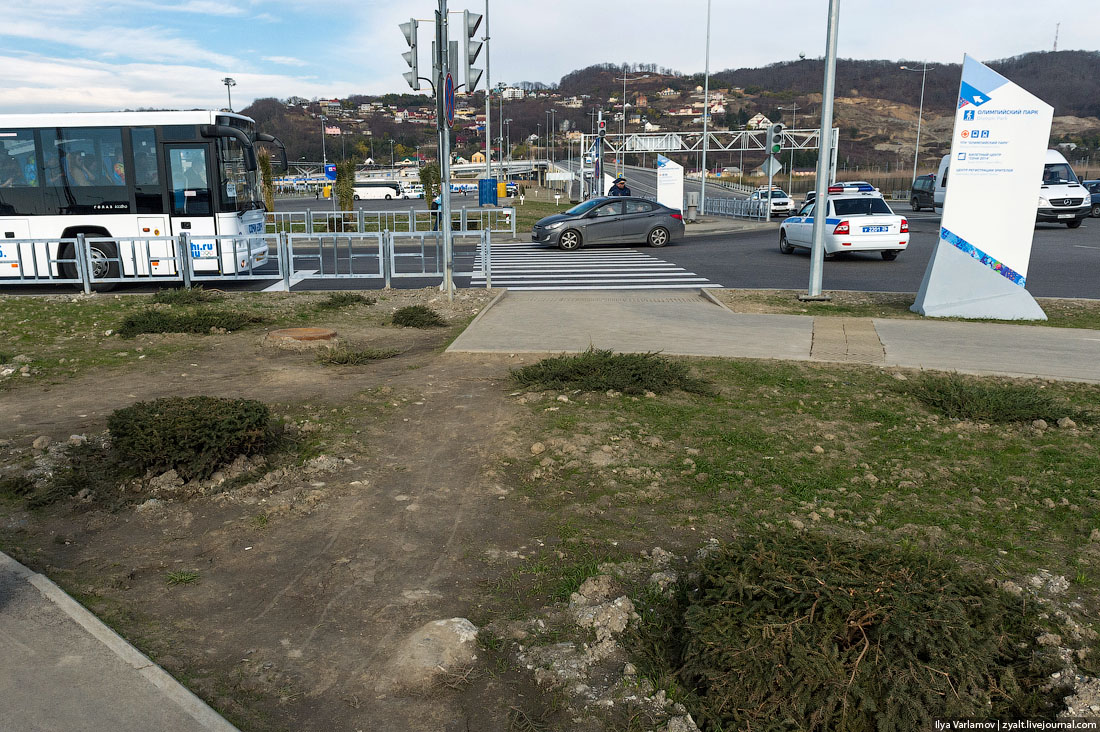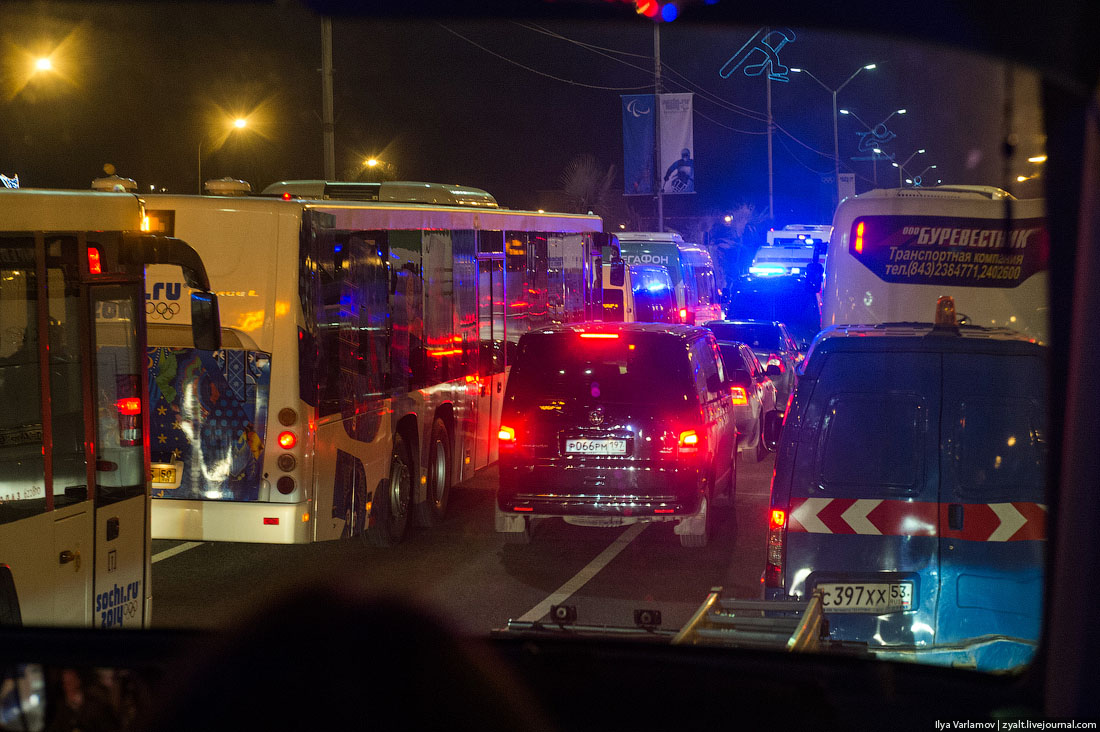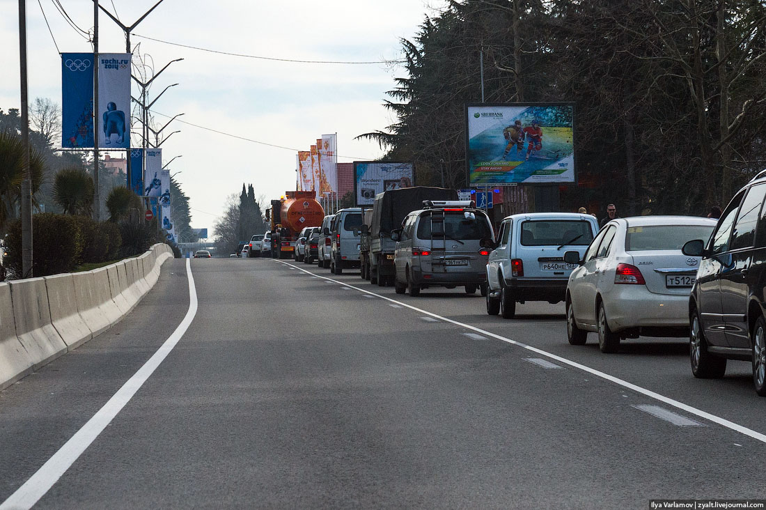 01. В Сочипостроилиновыедороги и развязки. Посравнению с тем, что былонесколько лет назад, разница, конечно, колоссальная. Надорогахввели "олимпийскиеполосы". Этовыделенныеполосы, покоторыммогутездитьтолькоаккредитованныемашины и автобусы. Говорят, завыезднатакуюполосуполагаетсяштраф 5000 рублей. Номестные всеравновыезжаютиногда. Вообщеместныйнародзаметнонервничаетиз-заолимпийскихнеудобств. Пропуска для машиннаолимпийскиеобъектыбыстрозакончились. Начерномрынке, послухам, такойпропускможнобылокупитьза 250 000 рублей. Арендоватьмашину с водителем (МерседесЕ-класса) с пропускомнаолимпийскиеобъектыстоит 500 000рублейна все времяОлимпиады...