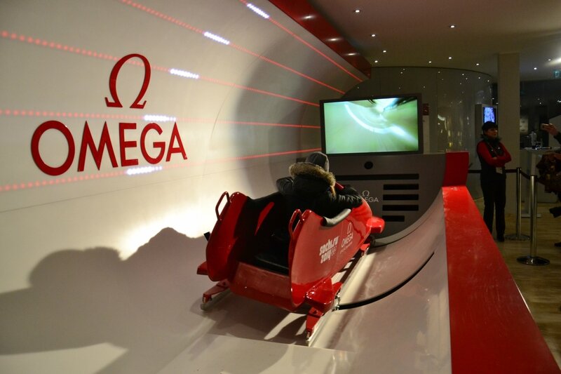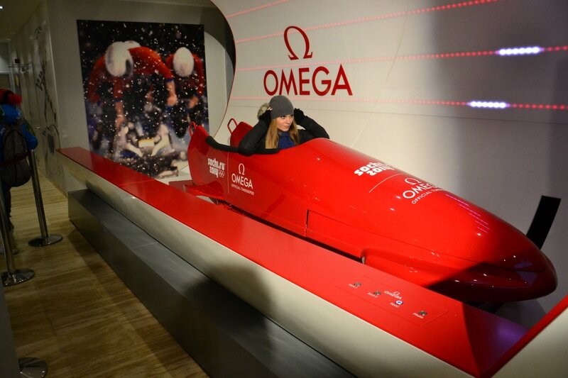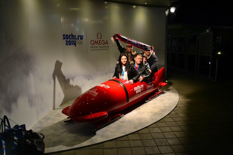 43. Внутри павильона боб, который симулирует катание по санно-бобслейной трассе.