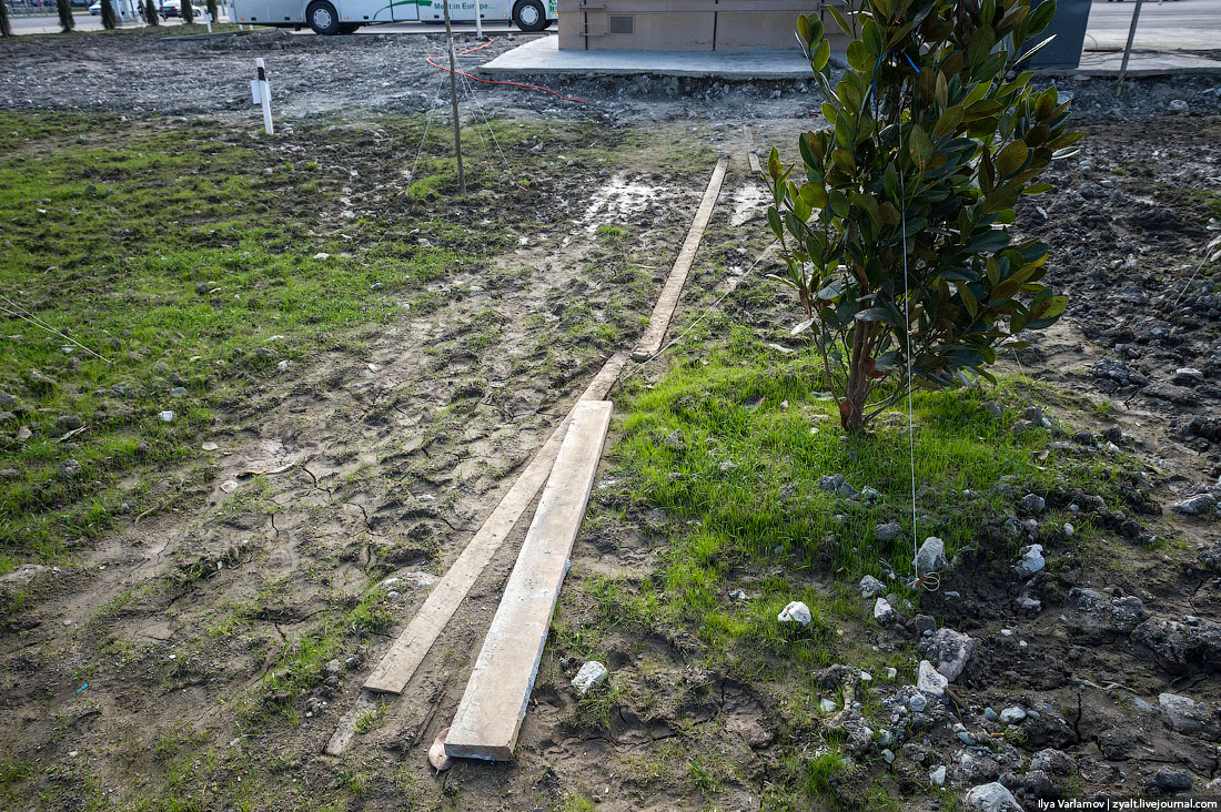 48. Чтобы гости не забывали, что они в России, в парке расставили заграждения. Зачем они здесь - никто не понимает. Все обходят их по газонам.