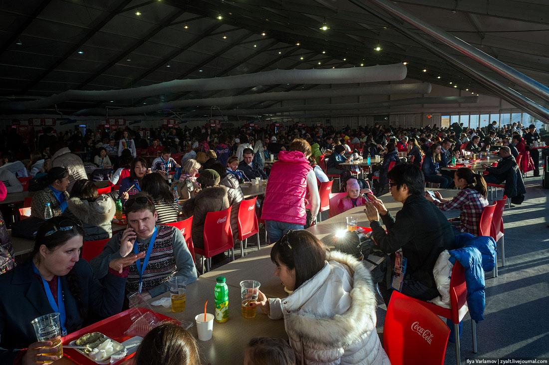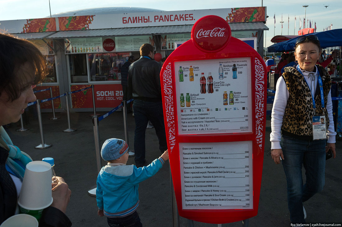 17. С едой проблемы. В основном гостей парка кормят фаст-фудом - блинами, хот-догами и т.д. Есть один ресторан всего, в него я не успел пока зайти. Никаких случайных компаний не пустили, так как с рекламой на Олимпиаде все сложно. Вы не может просто так открыть свой ресторан или поставить свой киоск с шашлыками на Олимпиаде, для этого вам надо стать партнером и заплатить много миллионов спонсорских взносов. Партнер Олимпиады - Кока-Кола, она и монополизировала общепит.