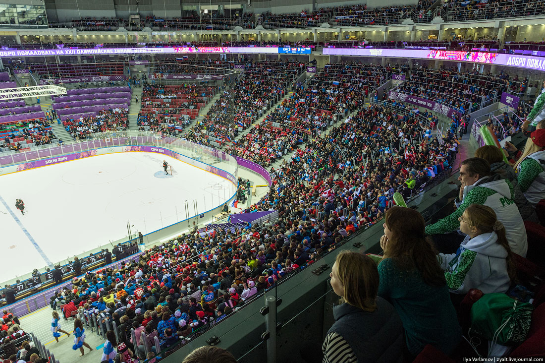 51. Стадион Большой. Вчера был хоккей, Канада играла с Австрией. Ну как играла, разнесла австрийцев 6:0. На стадионе проецируются флаги команд и счет матча.