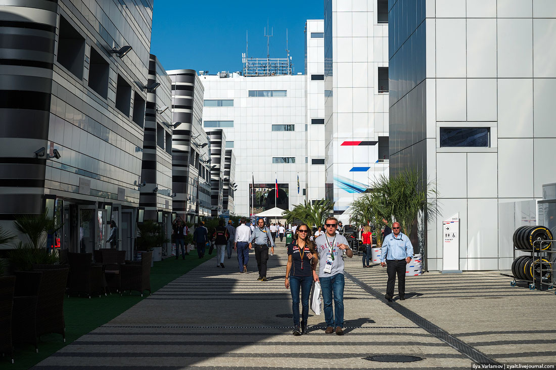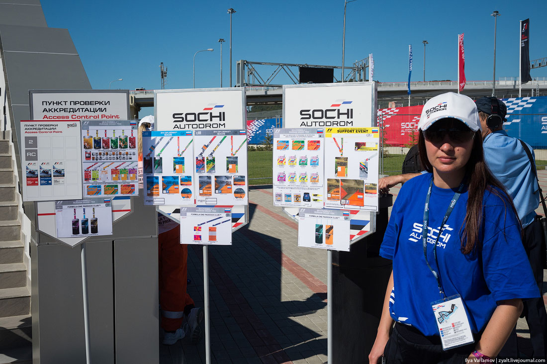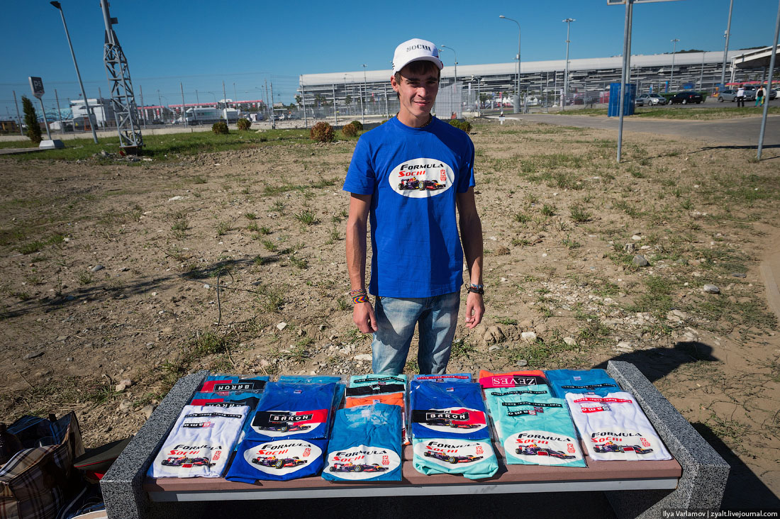 01. Начнем с оргвопросов. Формула проводится в Олимпийском парке, который еще полгода назад принимал Олимпиаду. Территория вокруг парка выглядит заброшенной. Даже газоны не смогли посадить. Зато перед входом куча продавцов нелегальных футболок, прямо под носом полиции. Но никто не понимает, что здесь не так.