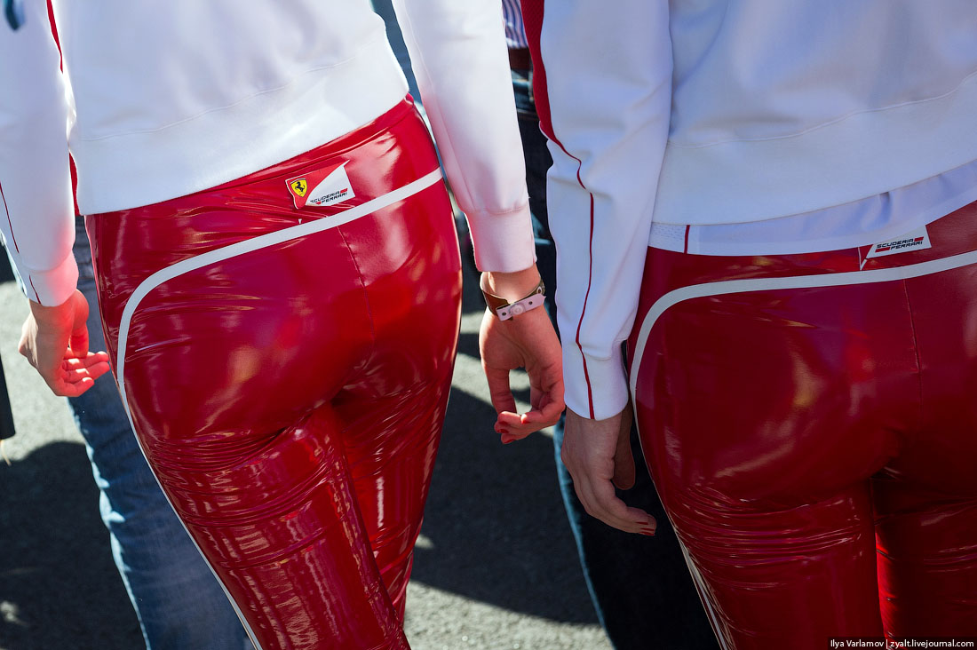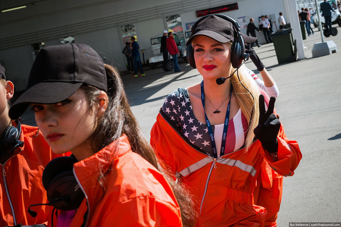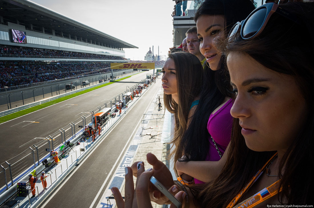 16. Девушки наблюдают за гонкой в Вип-ложе. Наблюдать они будут минут 5, потом уйдут пить шапманское и есть крабов. Удивительно, но большинству "особо важных гостей", выложивших по 200 000 рублей за билет в Паддок клуб, гонка была безразлична.