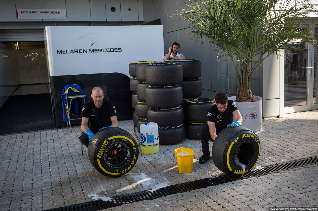 23. После тестовых заездов моют диски - на них налипает грязь и остатки резины.