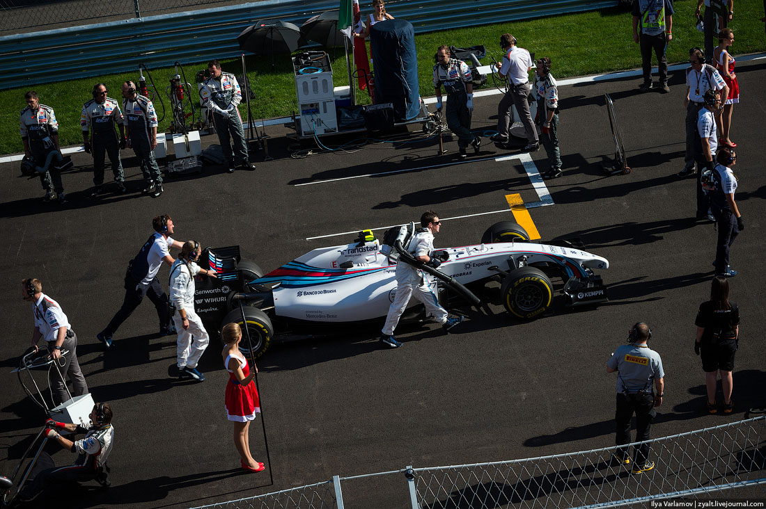 31. Команда разогревает шины перед гонкой и защищает от солнца пилотов.