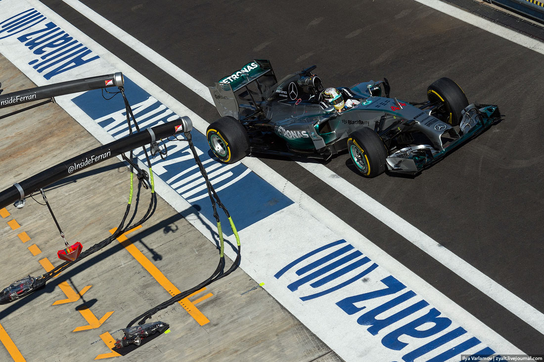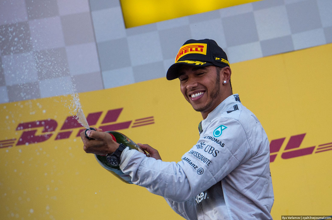 53. Победитель - британский пилот Льюис Хэмилтон, выступающий за команду Мерседес. Вообще Мерседес в этом сезоне берет почти все этапы. Льюис и Нико Росберг делят 1-2 места. Успех Мерседеса в этом сезоне можно объяснить тем, что они использовали команду мотористов с коммерческой линии, где у них есть огромный опыт в производстве турбо-моторов. С начала сезона собранные моторы опломбированы и ничего менять нельзя. Точнее сейчас разрешили кое-что менять, но это не должно сказываться на перформансе, а только на выносливости. Сейчас все бьются за разрешение внесения изменений в моторы, иначе Мерседес впереди всех на 4 года, и борьба становится не интересной.