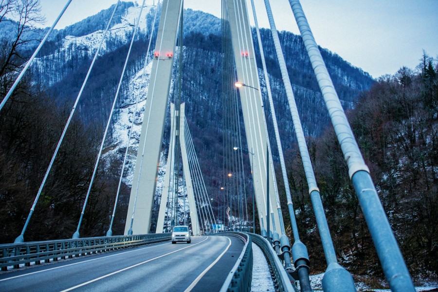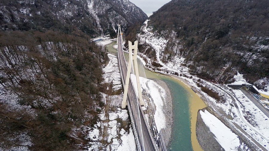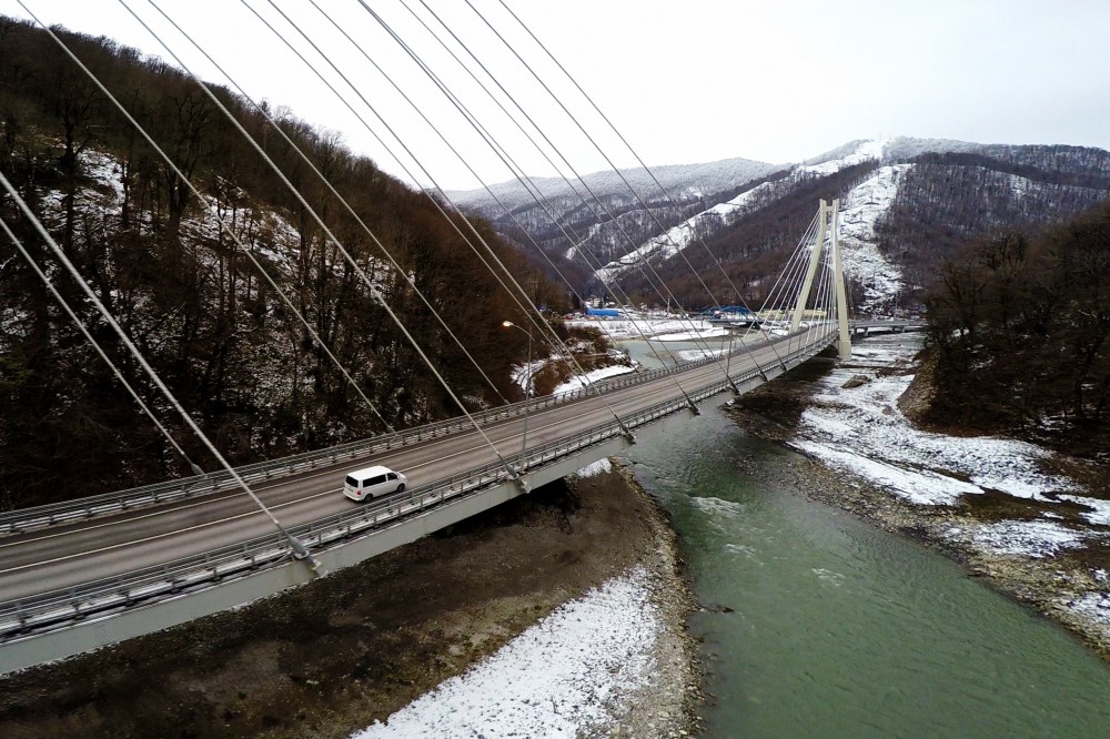 Вид сверху на новый вантовый мост ведущий в Красную Поляну