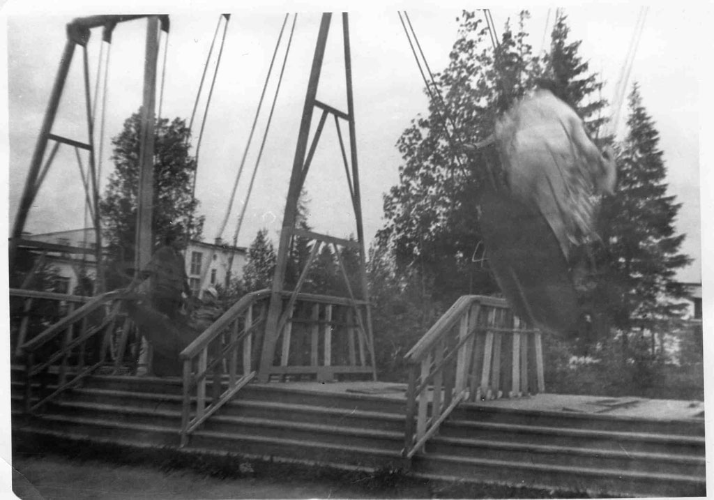 Снизу из площадки деревянная колодка выдвигалась и об днище качелей затормаживала их...