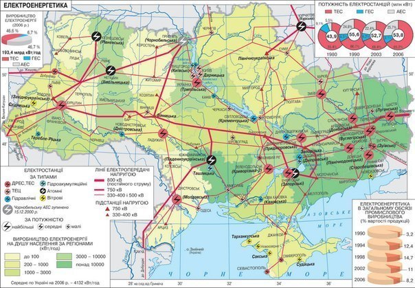 Электросистемы России и Украины строились в советское время по принципу замещения, тот же способ используется и в современной истории. К примеру, возьмем Запорожскую АЭС(средняя, по мощности) и Курскую АЭС(гигант, одна из самых мощных в Европе). От обеих станций линии расходятся по всей Украине и России. Если выходит из строя Запорожская, то электричество на Украину поступает с Курской. Если что-то случается в России, то по тем же линиям электричество уже идет с Украины. То есть, грубо говоря взаимообратный поток. Таким образом, чтобы не случилось, электричество будет всегда.