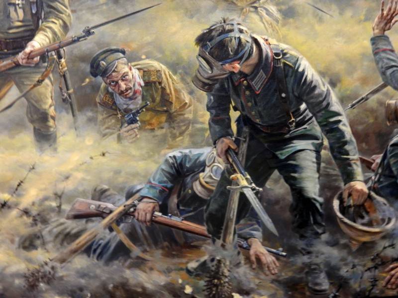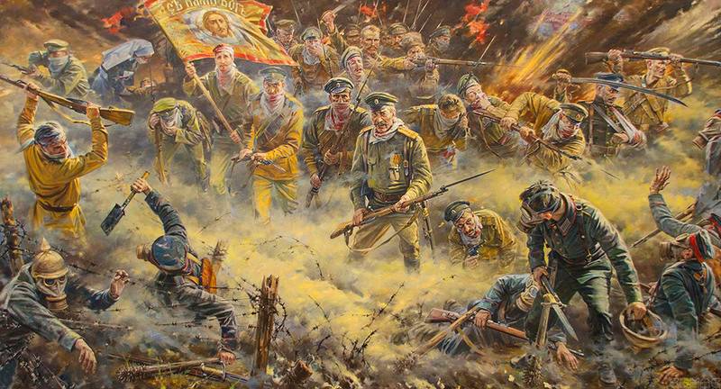 Картина "Мы - русские, с нами Бог!" показывает ключевой момент осады крепости Осовец, когда после газовой атаки оставшиеся в живых русские солдаты в штыковой атаке обратили в бегство 7000 немцев.