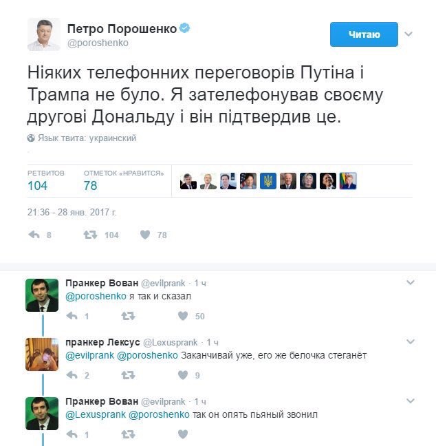 Обстановку радостливо пытался разрядить гетьман Украины пан Порошенко, который громогласно объявил, что Трамп звонил ему, а не Путлеру. Но твиттер и фейсбук потряс могучий стон, когда стало известно, что и в этот раз на связь с паном президентом вышел пранкер Вован. Влад Путин и Дональд Трамп между тем тайно шушукались по закрытой линии, окончательно объявив войну всем свободным людям и геям, к вящему неудовольствию Олега Пономаря. Стало вдруг совестливо и гадливо на душе. Как из душа окатило. Дотянулся проклятый Сталин. The Empire strikes back.