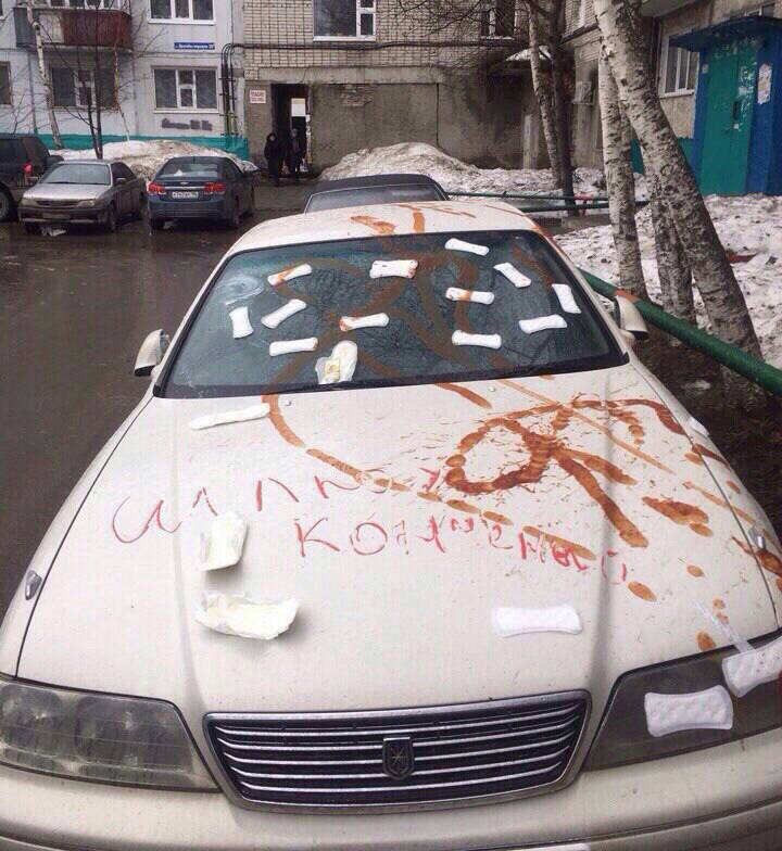 Сегодня утром жители Нижневартовска опубликовали в сети снимок автомобиля, обклеенного прокладками. Он припаркован в одном из дворов по улице Дружбы народов. Случайные свидетели расценили эту странную выходку, как способ отомстить. Помимо средств женской гигиены, на машине чем-то красным, похожим на помаду, написано неодобрительное слово, которым называют женщин, занимающихся проституцией, только в мужском роде. Также на снимке видно, что автомобиль измазан непонятной красно-коричневой жижей. Пользователи соцсетей предположили, что хозяин машины изменил девушке с другой. И лучше способа задеть чувства партнера она не придумала, нежели «разукрасить» его авто.