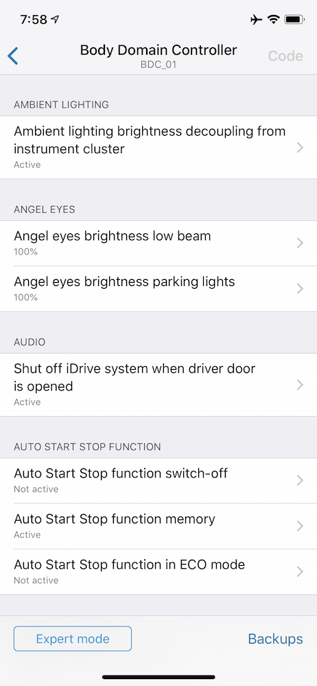 Отключение/память Start/Stop, управление амбиентной подсветкой, яркостью колец в фарах, включение дневных огней спереди и сзади, прописать светодиодные лампы вместо ксенона, отключить проверку ламп при старте,