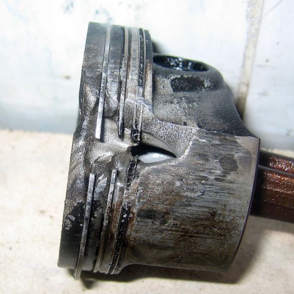 Короче поршень прогарает как на фото только в одном случае, - это локальный прорыв газов в картер , каждый рабочий ход часть заряда с большой скоростью устремляется в картер в одном месте, происходит это в момент перекладки поршня в вмт, если процесс пошел то плавит не только поршень, даже кольца стекают в поддон... работает как ацетиленовый резак который включается в вмт на мгновение каждый рабочий ход поршня... именно в этом месте при перекладке образовывалась "щель" в картер...