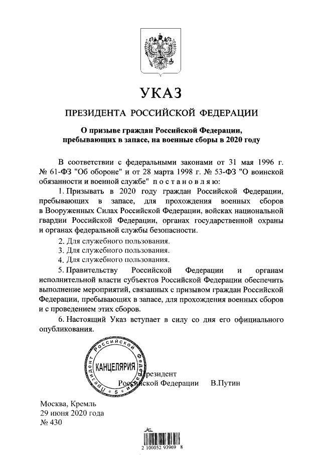 Путин подписал указ о призыве россиян из запаса на военные сборы