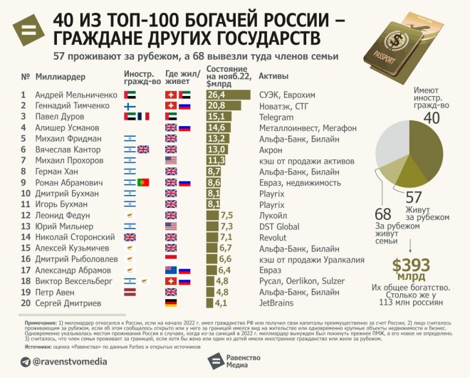 "из топ-100 российских миллиардеров 57 живут в основном за границей, а 68 вывезли туда семью. Выбор государств для жилья чаще всего падает на Великобританию, Швейцарию и США. 40 миллиардеров – граждане других стран, выяснили аналитики. Популярнее всего среди миллиардеров гражданство Кипра и Израиля, Великобритании, Канады и ОАЭ"
