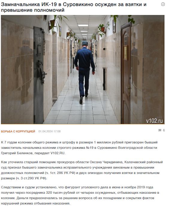 Но само руководство колонии было уличено в коррупции. В апреле бывший замначальника ИК-19 Григорий Беленков получил семь лет колонии за взятки и превышение полномочий. Он брал деньги от осужденных за облегчение режима.